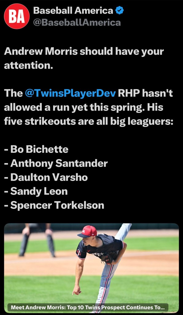 Meet Andrew Morris: Top 10 Twins Prospect Continues To Rack Up Ks, Open Eyes This Spring, headlines Baseball Americas update by Josh Norris, https://www.baseballamerica.com/stories/meet-andrew-morris-top-10-twins-prospect-continues-to-rack-up-ks-open-eyes-this-spring/