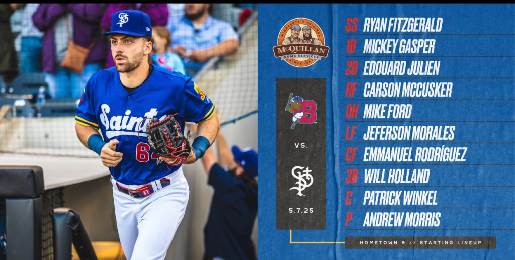 Wednesday, May 7th, 2025 – A “clean-shaven” Andrew went 5 solid innings against the Buffalo Bisons… 0 earned runs, 1 walk and 6 Ks. The pitching was exciting, plus Andrew made two key fielding plays: assisting in an out at first and catching the ball from the mound. It was a close game right to the end, but the Saint Paul Saints took the win with Mike Ford blasting a walk-off homer. Go team Saint Paul!